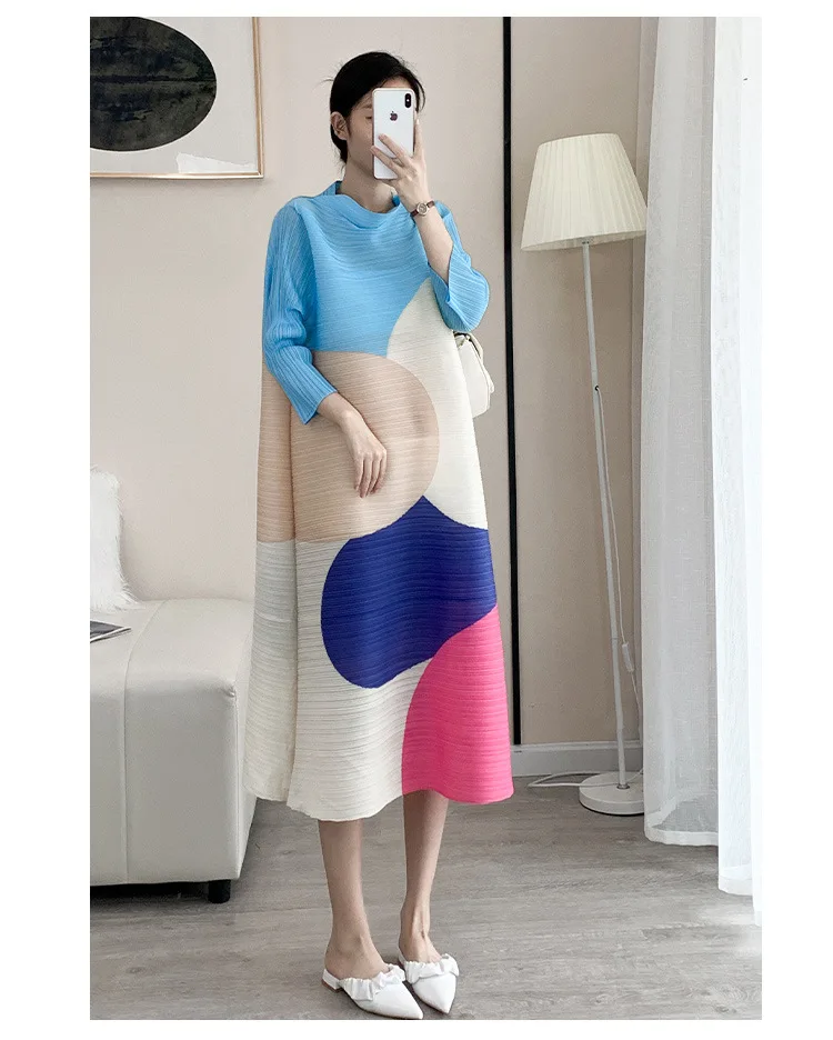 Miyake Women Pleated Dress Geometric Print Long Sleeve Half Turtleneck French Casual